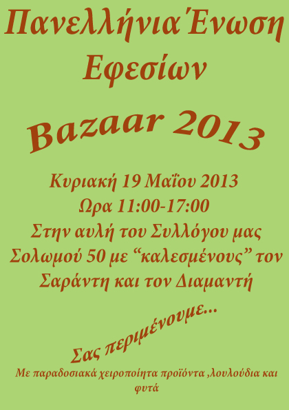 Στην συνέχεια θα ακολουθήσει κέρασμα στα γραφεία της ένωσής μας οπου στην αυλή της από τις 11 το πρωϊ, θα πραγματοποιηθεί το ετήσιο Παζάρι, στο οποίο θα βρείτε φυτά, χειροποίητα γλυκά και αλμυρά παρασκευάσματα και διάφορες κατασκευές των μελών μας. Θα σας περιμένουμε και μαζί με εμας ο «Σαράντης και ο Διαμαντής»