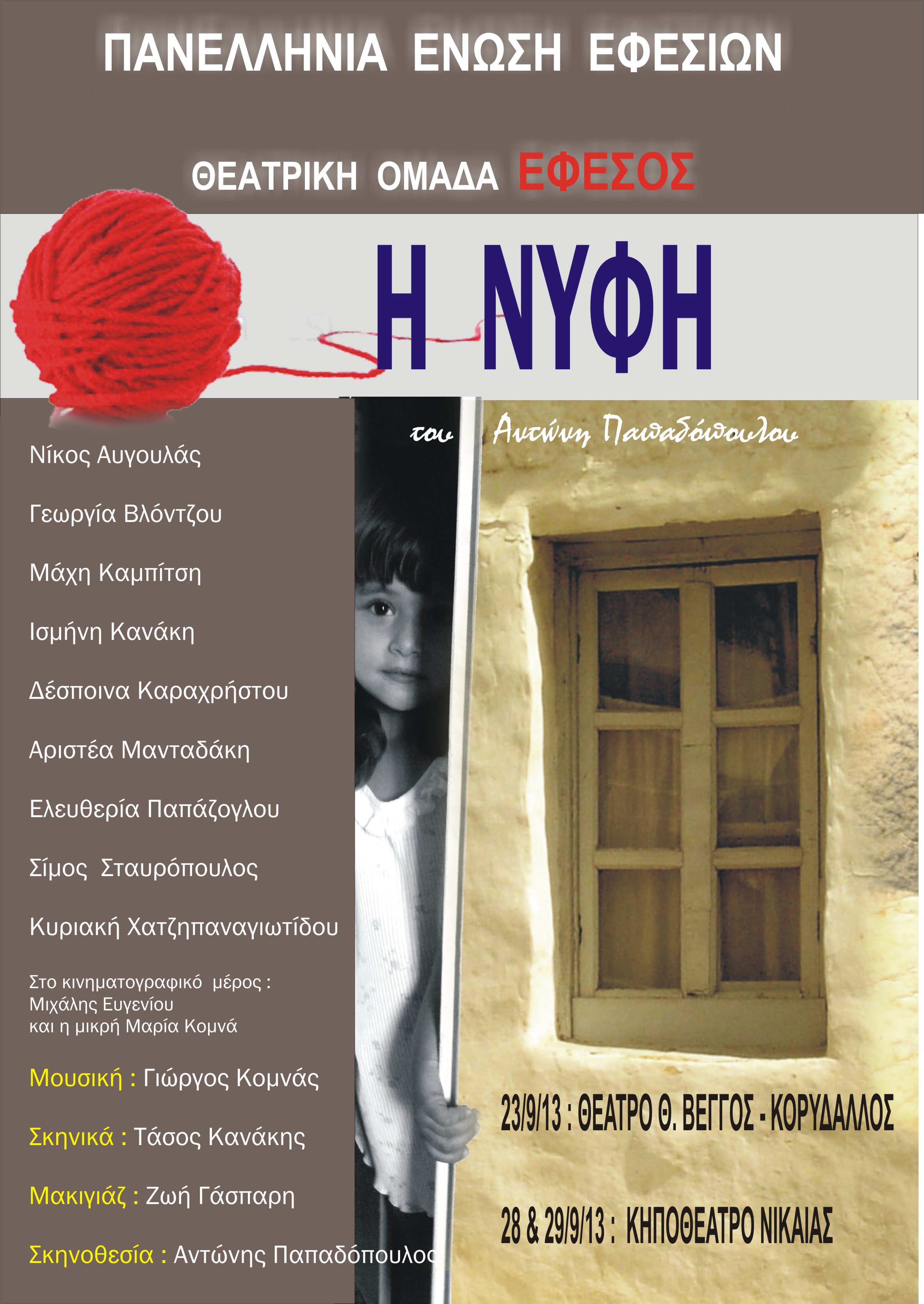 Η Πανελλήνια Ένωση Εφεσίων και η θεατρική της ομάδα «Έφεσος» σας προσκαλούν να παρακολουθήσετε το θεατρικό έργο » Η νύφη» του Αντώνη Παπαδόπουλου.Πρόκειται για την αληθινή ιστορία μιας κοπέλας απο την Μικρά Ασία στην Νίκαια του 1960.