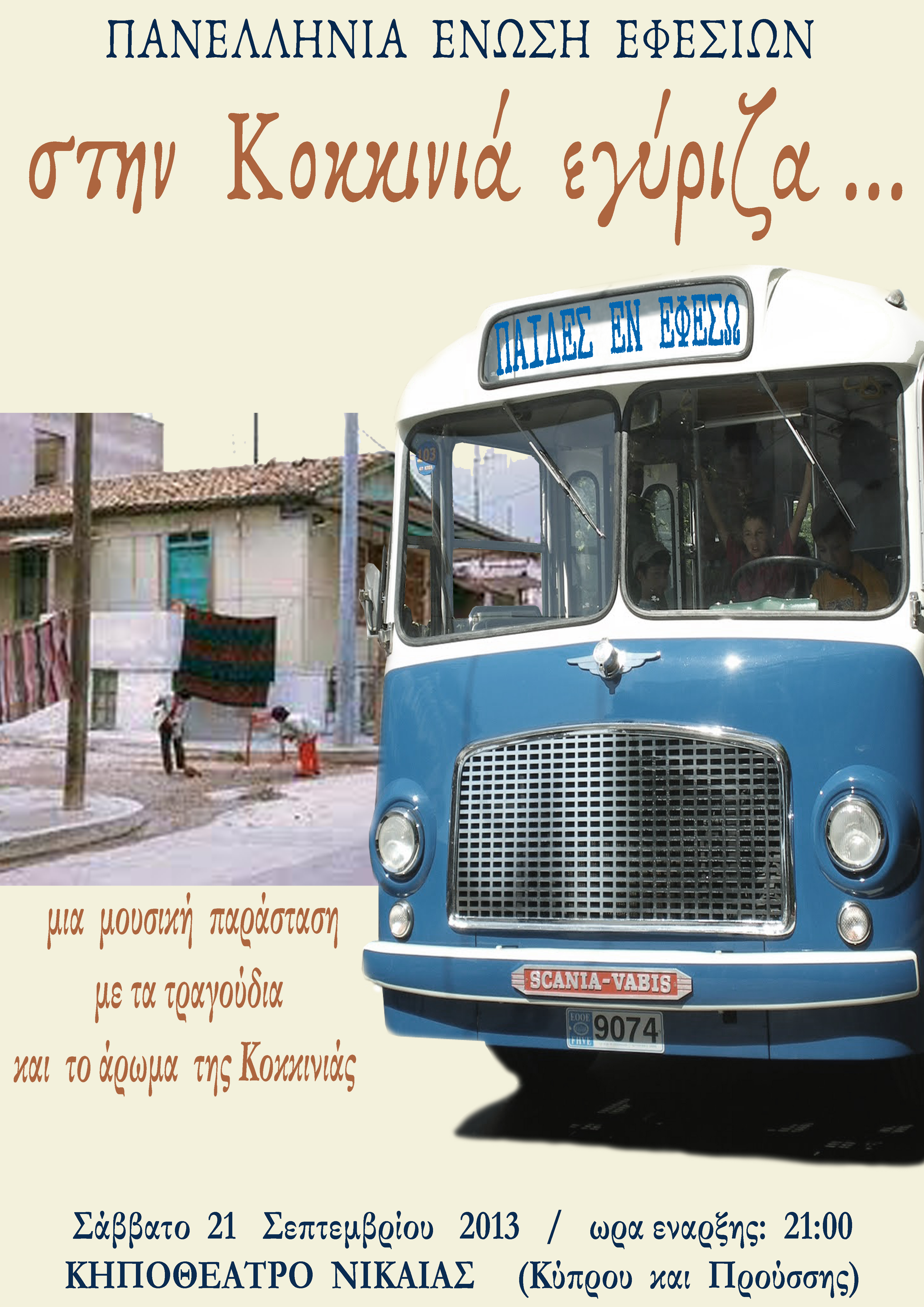 Η Πανελλήνια Ενωση Εφεσίων και η μουσική της ομάδα «Παίδες εν Εφέσω» σας προσκαλεί στην μουσική παράσταση «Στην Κοκκινιά εγύριζα…». Μια εκδήλωση με αφορμή τα 90 χρόνια από την θεμελίωση της πόλης της Νίκαιας και αφιερωμένη στη Κοκκινιά.Η μουσική ενώνει…και στην περίπτωσή μας ευελπιστούμε να μας ενώσει με το παρελθόν για να θυμηθούμε τα πρώτα μας βήματα στην Κοκκινιά και πως «βαδίσαμε».